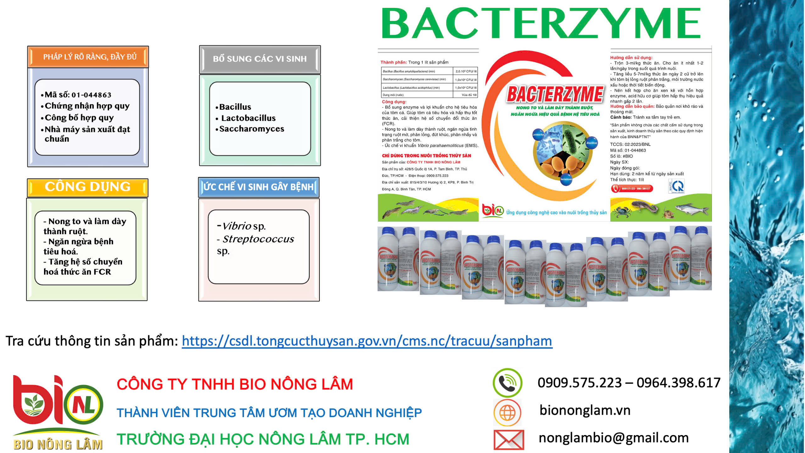Sản phẩm chứa các vi sinh vật có lợi cho hệ tiêu hoá của tôm cá như: Bacillus sp., Lactobacillus sp., Saccharomyces sp.... Giúp tôm cá tăng trọng nhanh, chắc khoẻ, tăng cường hệ miễn dịch và chuyển hoá thức ăn nhanh.