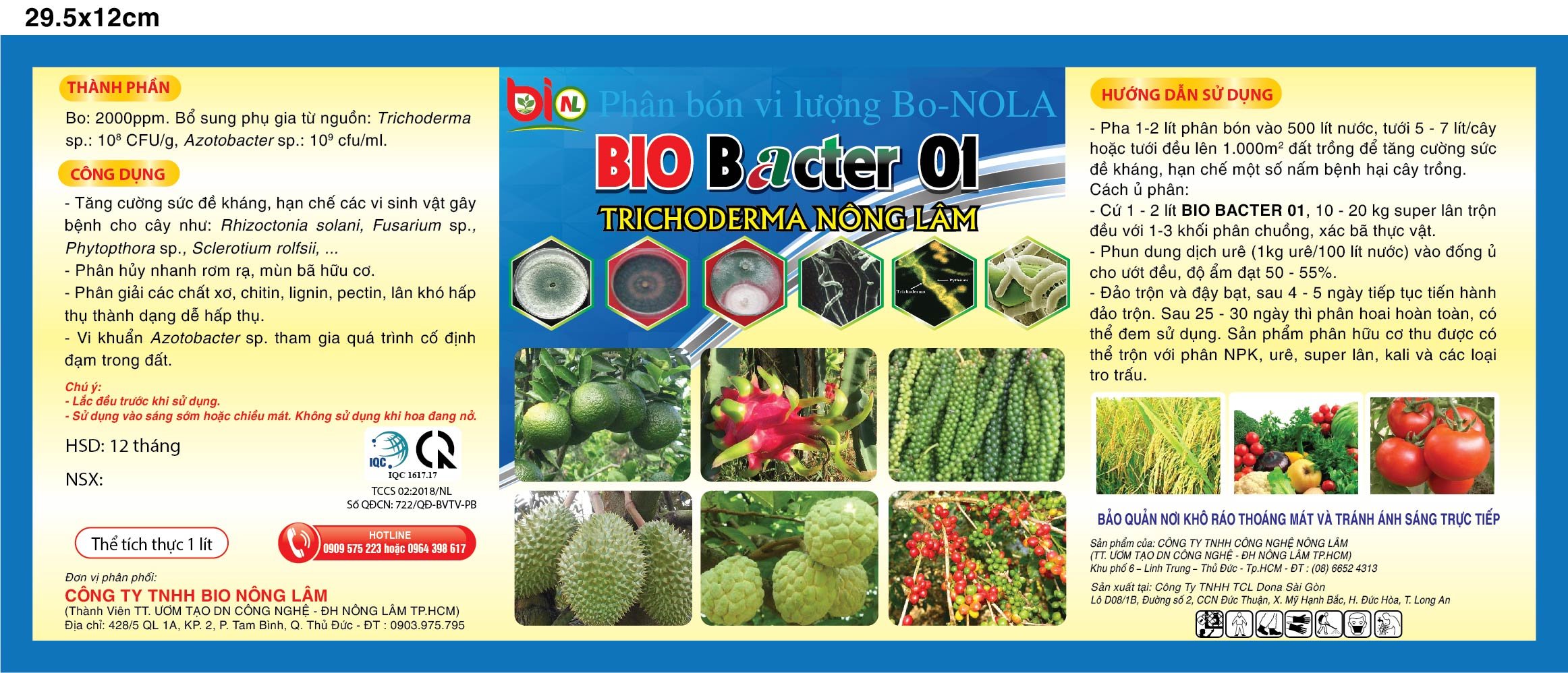BIO BACTER 01 là sản phẩm chứa vi sinh có lợi gồm Trichoderma và Azotobacter có vai trò trong phòng ngừa một số bệnh hại trên cây trồng, phân giải chất hữu cơ, cố định đạm